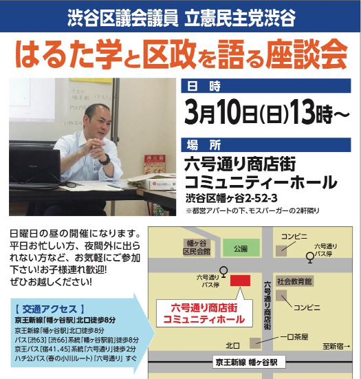 本日3/10(日)午後1時から幡ヶ谷の六号通り商店街コミュニティーホール(幡ヶ谷2-52-3)で「はるた学と区 […]